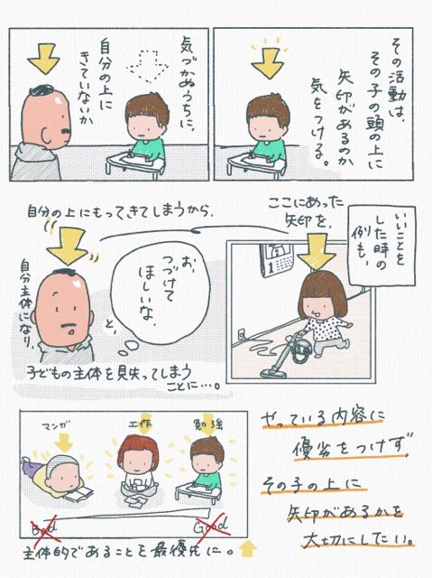 「矢印(注目)」が子供に向いていれば主体性が育ち、大人に向いていれば受け身にさせる、ということです。