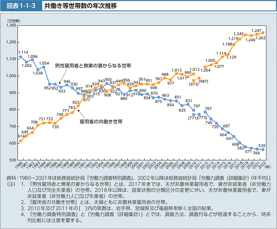 ちなみに、よく知られた事実として、「専業主婦世帯」と「共働き世帯」の数は1990年代半ばに逆転しました。