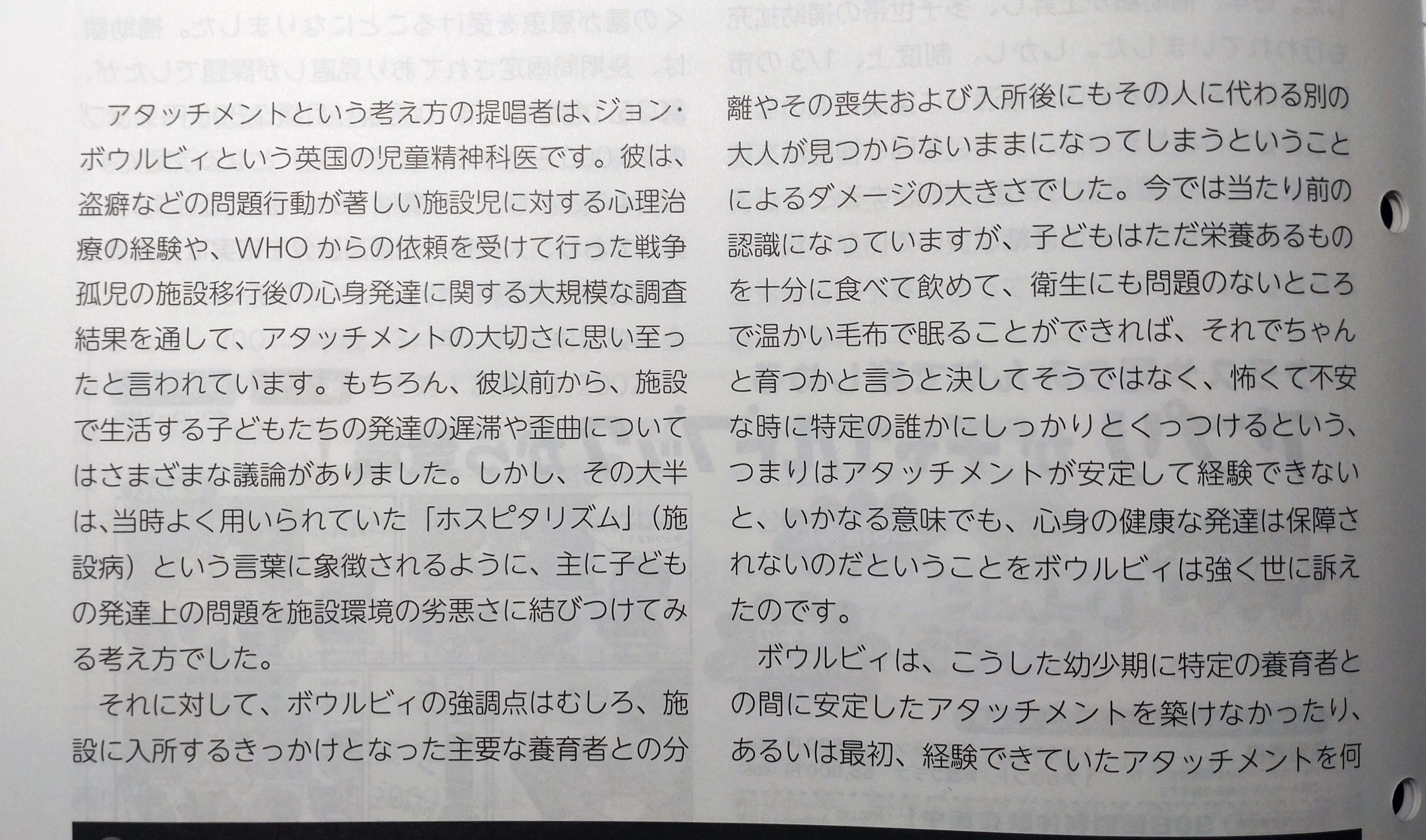 ボウルビィは、心身の健康な発達には特定の養育者との「アタッチメント」が不可欠と提唱した。